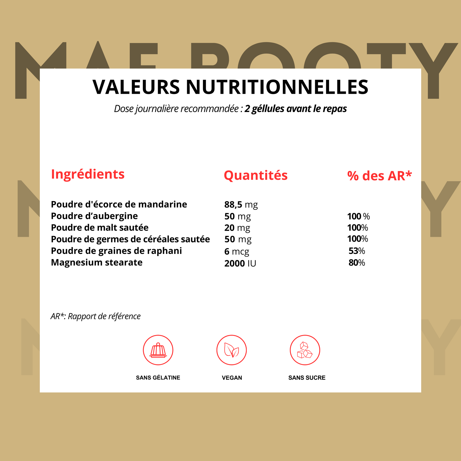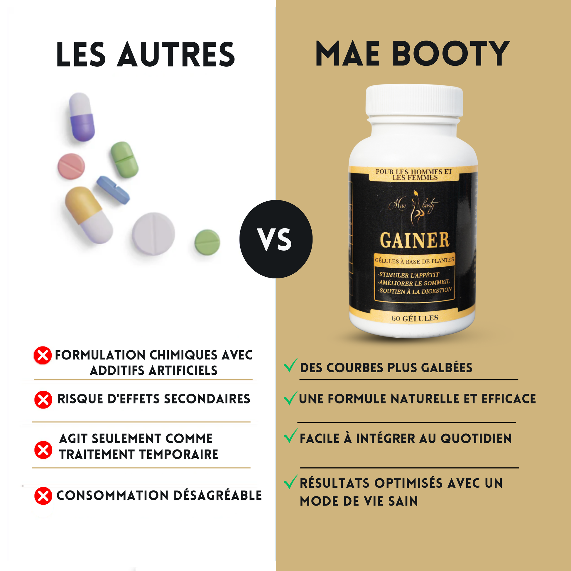 Le Gainer de Mae booty est un supplément nutritionnel conçu pour aider à prendre de la masse musculaire. Avec un mélange de protéines, de glucides et de lipides, il offre les nutriments nécessaires pour soutenir la croissance musculaire. Consommer ce gainer en plus de vos repas habituels peut vous aider à atteindre vos objectifs de prise de masse.